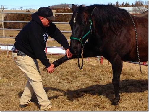 No Blue is not perfect. As my farrier says, Blue can be a “prick”. Since he hasn’t been in work mode, he has decided he doesn’t need to pick up his feet for the farrier and ended up with the “twine across the gums” the last time. So I decided to set him up for success with this vet and worked with him on picking up his feet. Using my own version of clicker training, I would pick up his foot and if he held it quiet, click with my tongue and reach behind me with a treat. Blue is very food motivated. After our session, he stood quietly while John trimmed him and he was ready to go for the vet today.