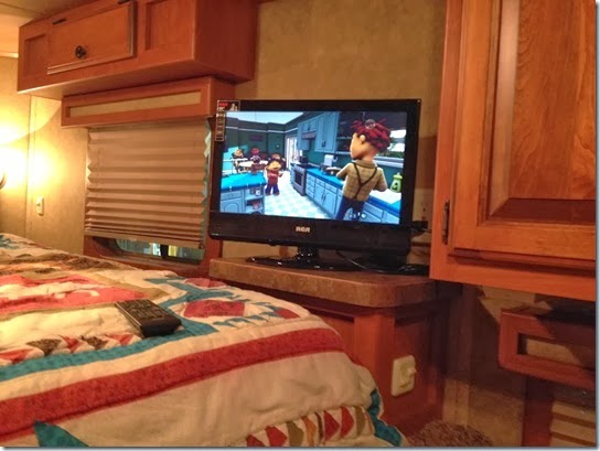 Years ago, I bought a flat screen television and DVD player for our Sundowner trailer. I even bought all the hardware to have it installed. But when I told John where I wanted it installed, he didn’t like my plan. So it became a stand-off. And neither one of us would give on where we would put it. While I am pretty handy, I was not gutsy enough to drill into the trailer myself, so it was never installed. This new trailer had all the wiring and antenna for a television. It just needed the tv. And look! It works! I still plan to hook it to a swivel base but for now, just lay it on the bed when traveling.